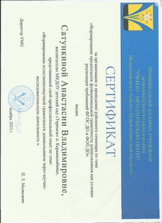 Сертификат за организацию и проведение районного семинара-практикума для педагогов ДОУ "Детское экспериментирование-путь познания окружающего мира"