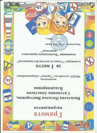 Грамота за 1 место в конкурсе "Семья за детство без опасности!" номинация "Воспитываем грамотного пешехода!"