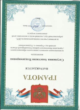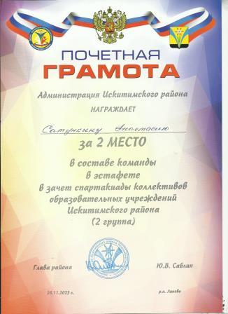 Почетная грамота от Администрации Искитимского района за 2 место в составе команды в эстафете в зачете спартакиады коллективов образовательных учреждений Искитимского района