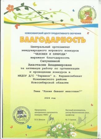 Благодарность Центральный оргкомитет международного игрового конкурса "Человек и природа" выражает благодарность за активную работу по организации и проведению конкурса по теме "Какие бывают животные?"