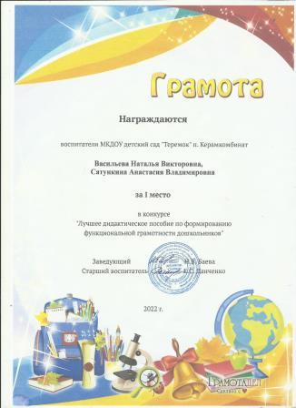 Грамота за 1 место в конкурсе "Лучшее дидактическое пособие по формированию функциональной грамотности дошкольников"