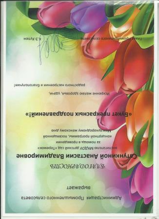 Благодарность за помощь в проведении концертной программы, посвященной Международному женскому дню