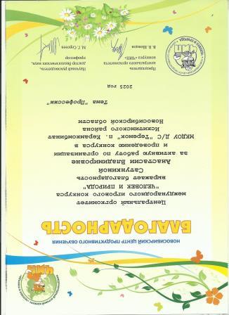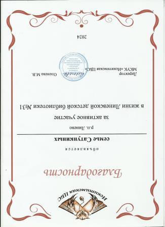 Благодарность за активное участие в жизни Линевской детской библиотеки