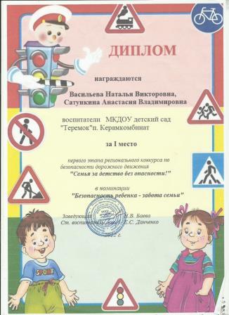 Диплом за 1 место первого этапа регионального конкурса по безопасности движения "Семья за детство без опасности!" в номинации "Безопасность ребенка-забота семьи"