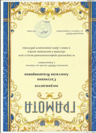 Грамота за творческий профессиональный вклад в дело обучения и воспитания детей, и в связи с Днем дошкольного работника
