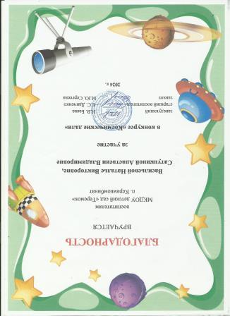Благодарность за участие в конкурсе "Космические дали"